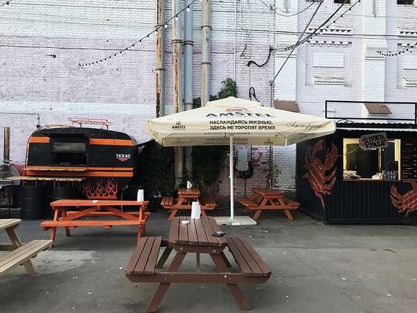 Если присматриваться к деталям, то можно заметить колючую проволоку, растянутую вдоль забора с граффити, ржавую трубу над вагоном ТЕХАС Bar-B-Quе и обшарпанную кирпичную стену за сценой. Пока не ясно, что будут делать, когда внезапно пойдет дождь, — вся мебель и аппаратура стоит либо под открытым небом, либо под небольшой крышей. Бар сделали большим, но учтите, что вечерами там бывает много людей. Если не быть наглым, в очереди можно простоять не меньше часа. А в лучшем случае — 15 минут.