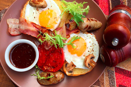 Ни так давно в JUST. Bar&Kitchen запустили завтраки, их меню обещали регулярно обновлять. В сентябре, например, добавили Английский завтрак. Английский завтрак — это яичница, бекон, томат, фасоль и домашняя сосиска. Стоит все это 300 рублей вместе с напитком, а наесться можно на полдня вперед.