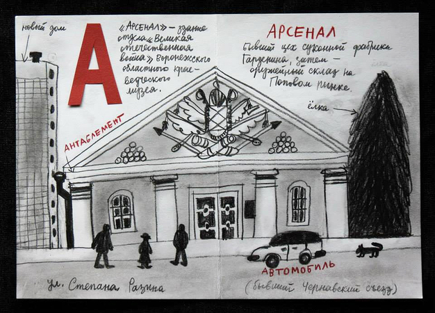 Мир не движется непременно к лучшему, а наоборот, делается всё хуже и хуже. В «Воронежской Азбуке» я пытаюсь ухватить кусочки того хорошего, что ещё есть. Стараюсь найти на мои 33 буквы какие-то кусочки города, которые меня радуют. Например, на букву Ю будет Ю.В.Ж.Д. Эта башня мне нравится, хотя и нелепо, что собой она скрыла музей имени Крамского. Но в этом тоже есть шарм. На букву Ф у меня Филармония, на У — Утюжок, потому что это любопытный памятник конструктивизму. На Г я нарисовал гребную базу «Буревестник» на Придаченской дамбе, которая мне очень симпатична.